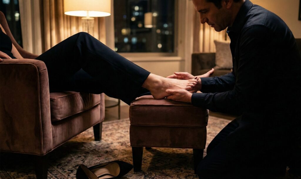 She extended that foot. Not towards me, but just out, resting it on the ottoman in front of her. It was perfect. Immaculately pedicured, the nails a deep, blood-red that contrasted with her pale skin. The arch was high, the toes long and perfectly shaped. And there, on the delicate skin, was the faint, glistening sheen of perspiration, the subtle imprint of the shoe’s leather. It was the most intimate, raw, and honest thing I had ever seen.