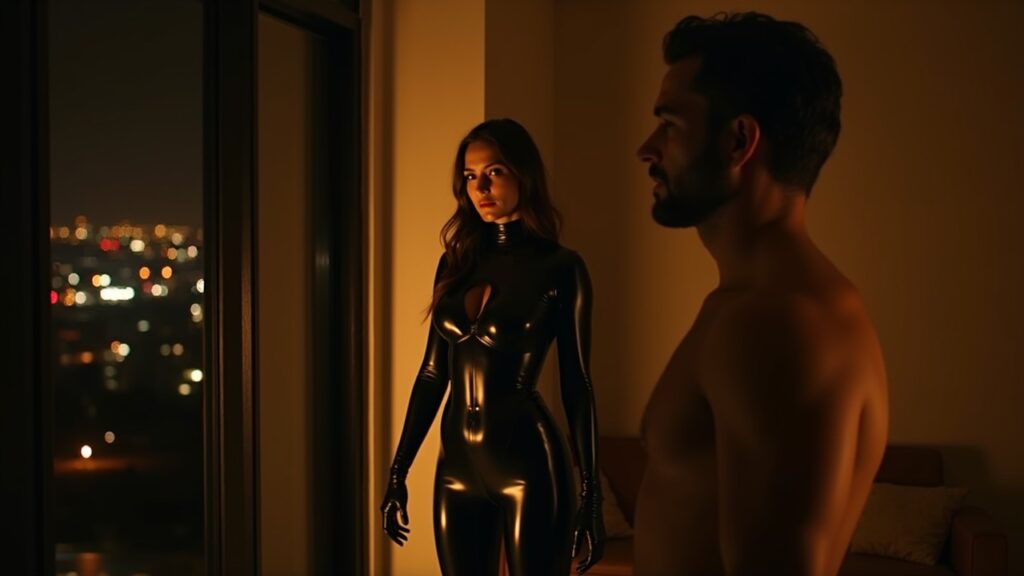 She opened the door wearing black. Not the ordinary kind of black—this was a second skin. The air in the room smelled faintly of rubber and something darker: polish, warmth, expectation.