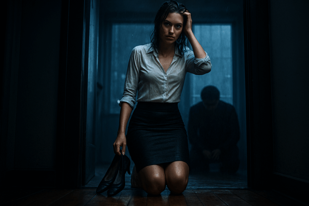 The night I completely shattered was a Friday in October. Rain was smashing against her studio windows like it wanted in. She’d been out drinking with coworkers, came home soaked to the bone, white blouse plastered to her tits, nipples hard from the cold. She kicked the door shut and just stood there, dripping on the rug, staring at me on the couch like I was something she’d already decided to break.